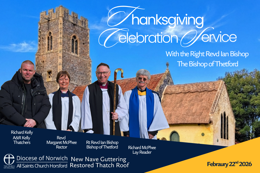 The Rt Revd Ian Biship, Bishop of Thetford, blessed and gave thanks for the completed roof project, nave gutters and new thatched roof, Sunday 22nd Feb 2026.